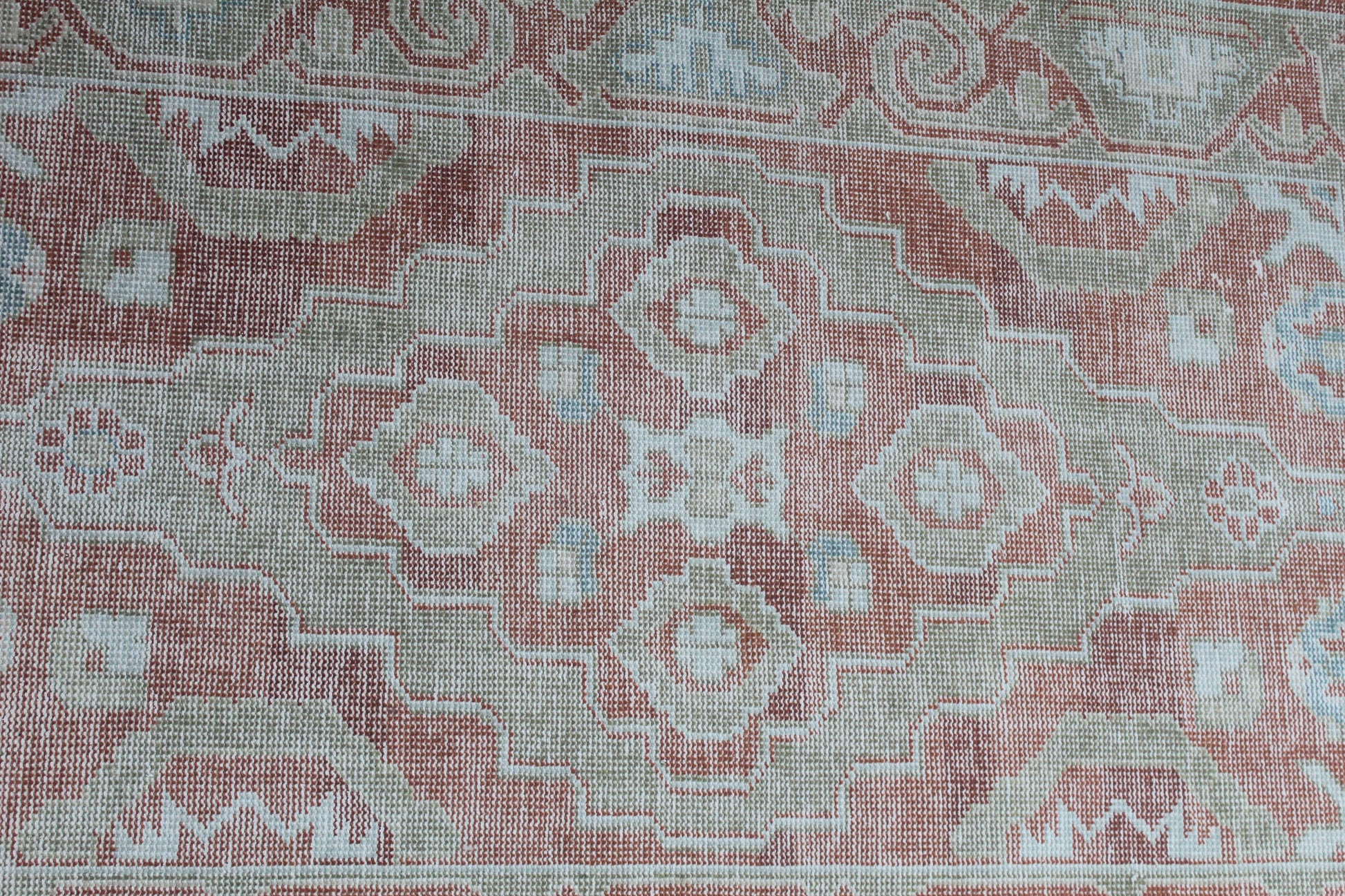 Meticulously hand-knotted, this premium 5'x8' wool area rug showcases a sophisticated geometric design in rich red and olive hues. The expert craftsmanship ensures exceptional durability while the natural wool fibers provide superior texture and warmth. This distinctive piece adds architectural interest and refined elegance to any living space.